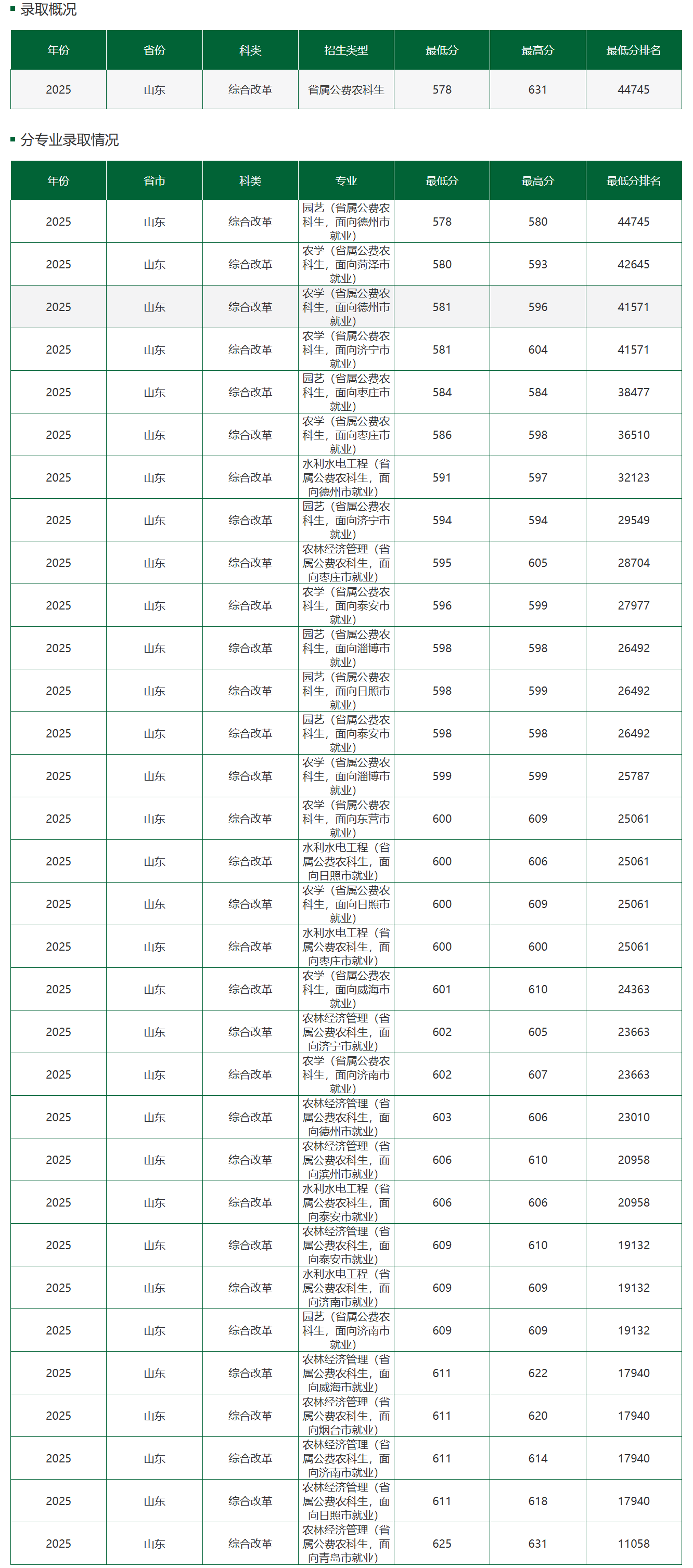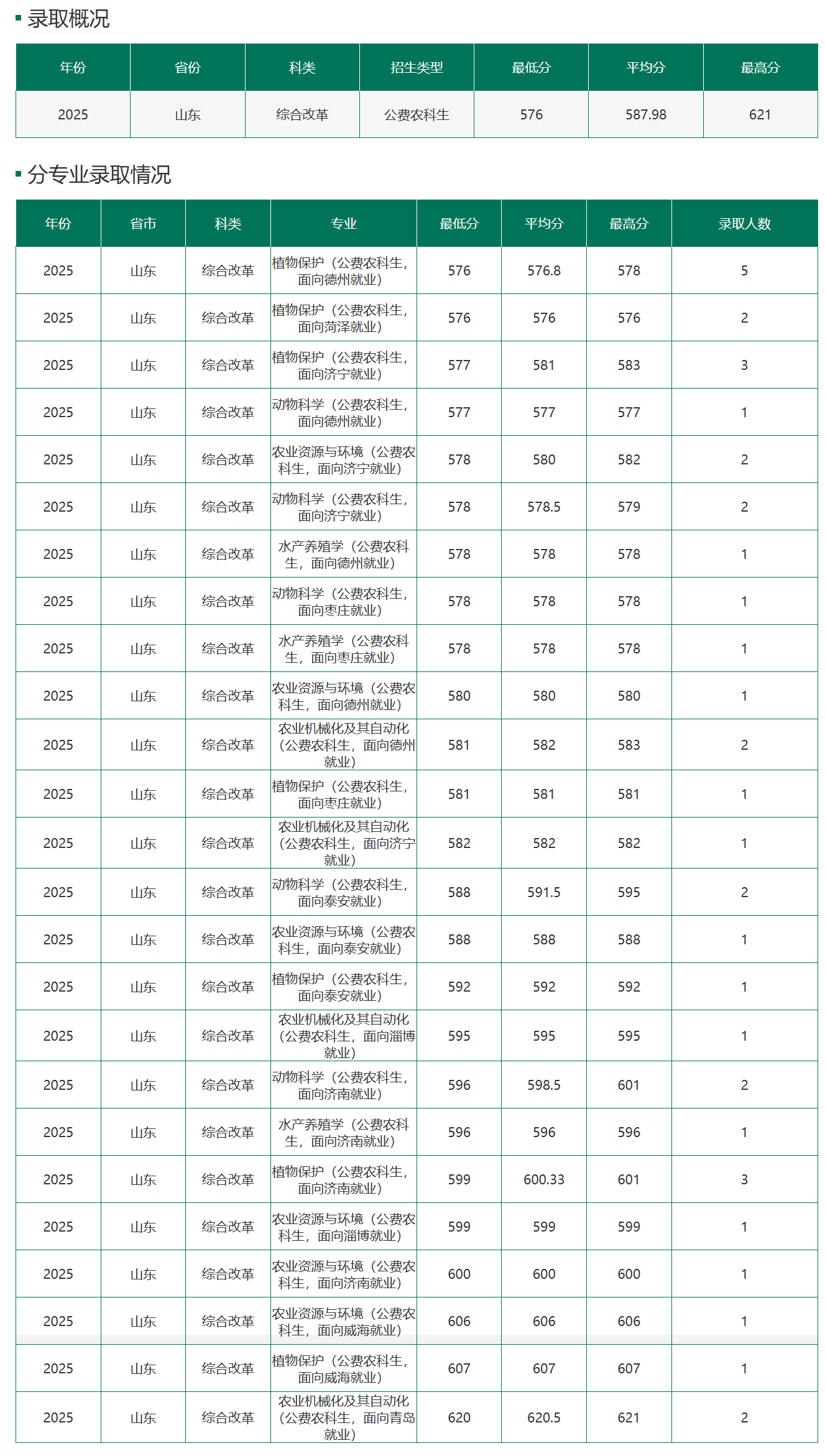 2025年山东农业大学录取最高分631分(农林经济管理,面向青岛市就业),青岛农业大学最高分621分(农业机械化及其自动化,面向青岛就业)。
