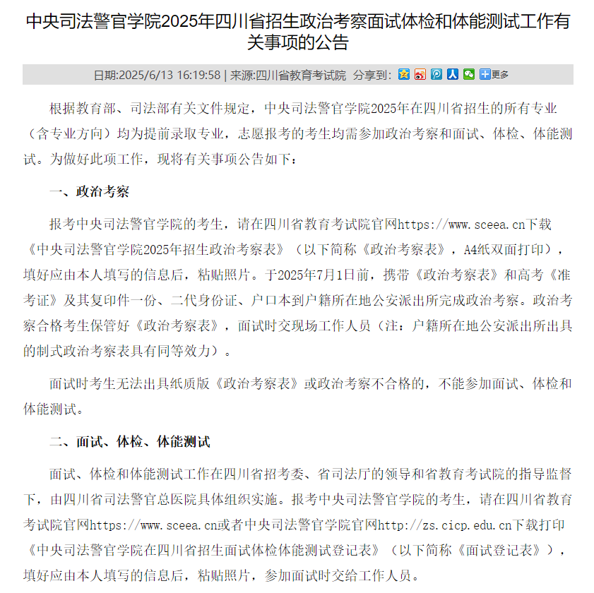 5.选拔流程:报考考生必须参加由四川省公安厅统一组织的面试、体检和体能测试。只有通过这些考核的考生,其志愿才有效。