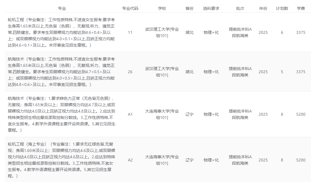 6.志愿填报:符合身体条件的考生,可直接在本科提前批A段填报航海类专业志愿,无需提前单独面试,但录取时会审核体检信息。