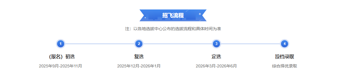 3.空军/海军招飞:流程包括网上报名、初检预选(2025年9-11月)、全检定选(2026年3-4月),最终在高考后根据高考成绩和选拔结果择优录取。
