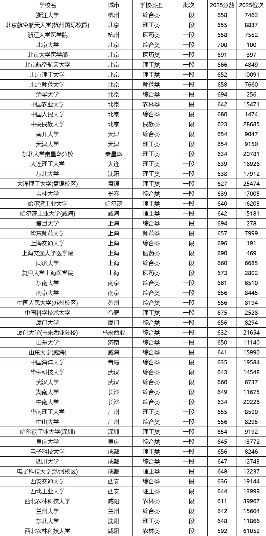 包括浙江大学(658分)、南京大学(656分)、北京航空航天大学(666分)、中国科学技术大学(675分)、武汉大学(660分)等。这些学校多为综合实力强劲的985高校,分数集中在650–670分之间,位次在5000–10000名左右。例如,同济大学660分,位次6685;华东师范大学657分,位次7999。