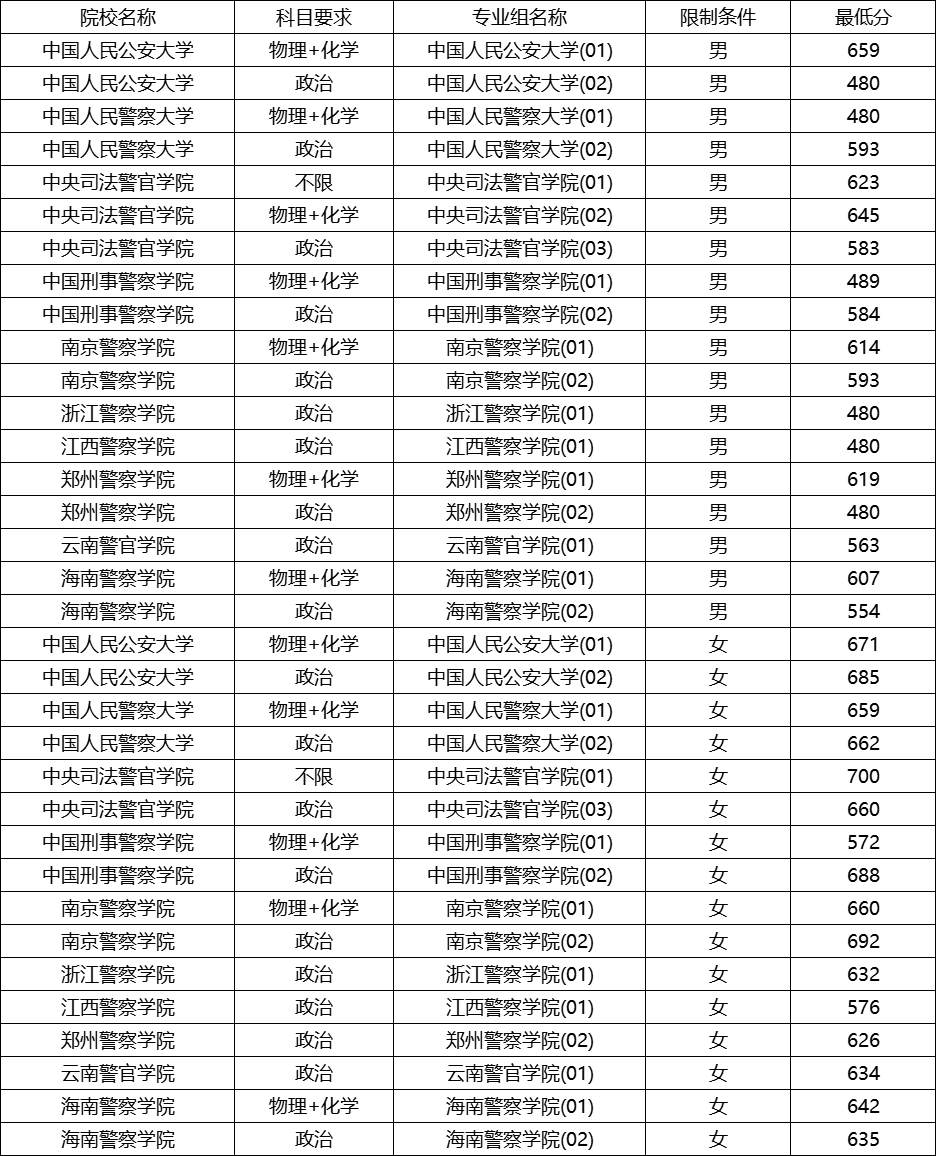 省属院校中,海南警察学院“物理+化学”专业组女生642分,“政治”专业组635分;云南警官学院“政治”专业组634分;浙江警察学院“政治”专业组632分;郑州警察学院“政治”专业组626分;江西警察学院“政治”专业组576分。虽然省属院校分数相对较低,但仍普遍高于同校男生分数30-80分不等。