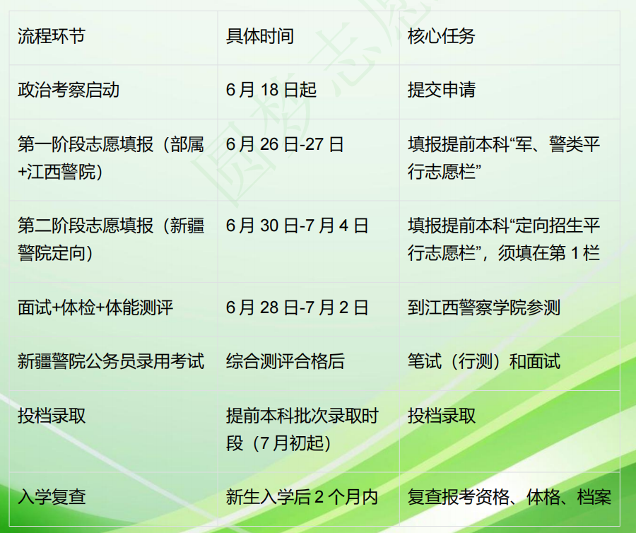 1.第一阶段(约6月26-27日):填报除新疆警院外的6所院校。在江西省教育考试院网上填报系统,选择 “提前本科—军、警类平行志愿栏” ,最多可填45个院校专业组。