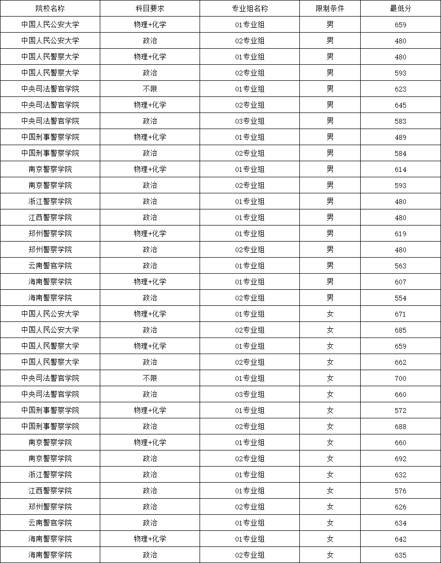 在2025年海南高考中,中国人民警察大学投档线最高的是02专业组(女),为662分;投档线最低的是001专业组(男),为480分。具体各专业组投档线详情如下:
