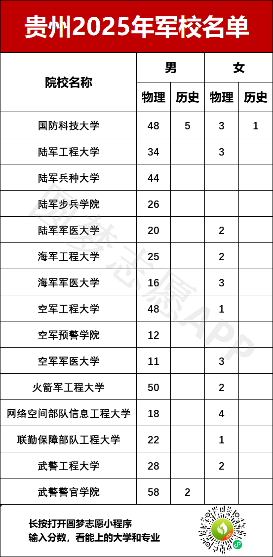 2025年在贵州招生的军校共计15所,分别为: