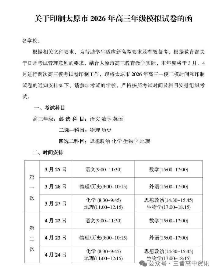 2026年山西太原高三第一次模拟考试(简称“太原一模”)将于3月25日(星期三)至27日(星期五)正式举行。本次考试由太原市统一组织,覆盖全市各高中学校,旨在帮助学生适应新高考要求、检验一轮复习成果、查漏补缺。