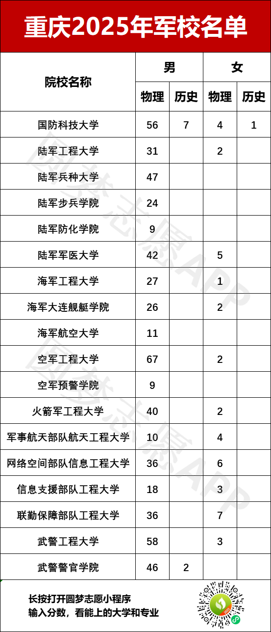 2025年在重庆招生的军校共计18所,分别为: