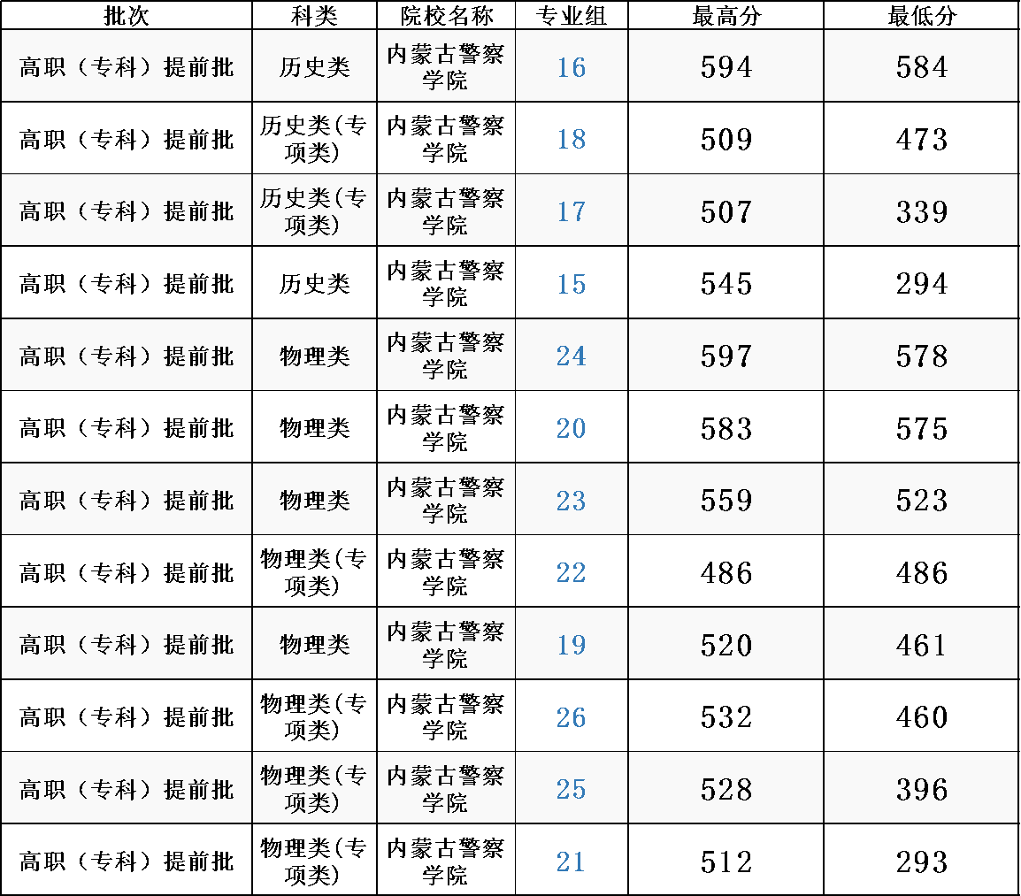 根据2025年数据,内蒙古警察学院专科、本科提前批公安专业在内蒙古的录取分数线如下: