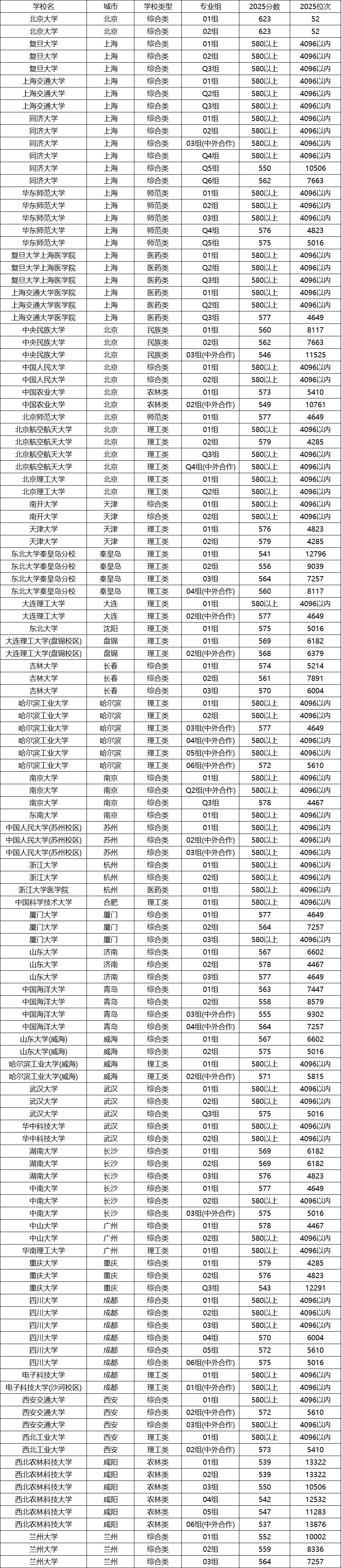 复旦大学所有专业组分数均在580以上,位次4096以内。包括01组、02组和Q3组,涵盖综合类、医学类方向,竞争非常激烈。