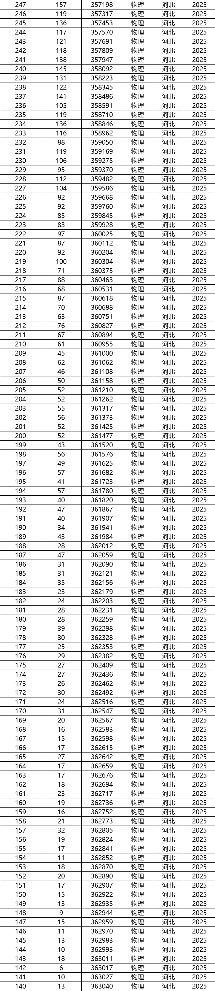 在2025年河北物理类高考中,650分有189人,650分以上累计有3294人;630分有424人,630分以上累计有9436人;600分有786人,600分以上累计有27073人;580分有999人,580分以上累计有44928人;550分有1358人,550分以上累计有81112人;500分有1658人,500分以上累计有160507人;450分有1302人,450分以上累计有236491人;400分有908人,400分以上累计有291853人;300分有310人,300分以上累计有346271人等。