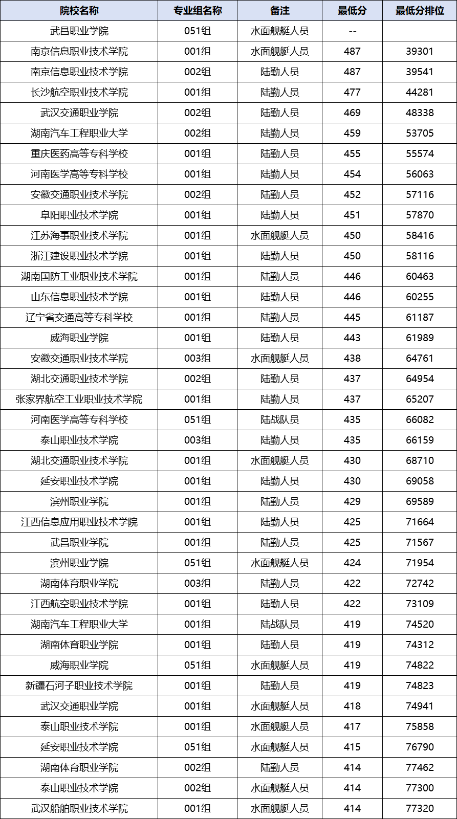 2025年定向士官学校在安徽省历史类的录取分数在414-487分之间,录取最低位次在39301-77320之间,其中武汉船舶职业技术学院001组(414分)的录取分数最低,水面舰艇人员,其次是泰山职业技术学院002组,录取分数为414分(77300名),录取的是水面舰艇人员;南京信息职业技术学院001组(487分)的录取分数最高,录取的也是水面舰艇人员。