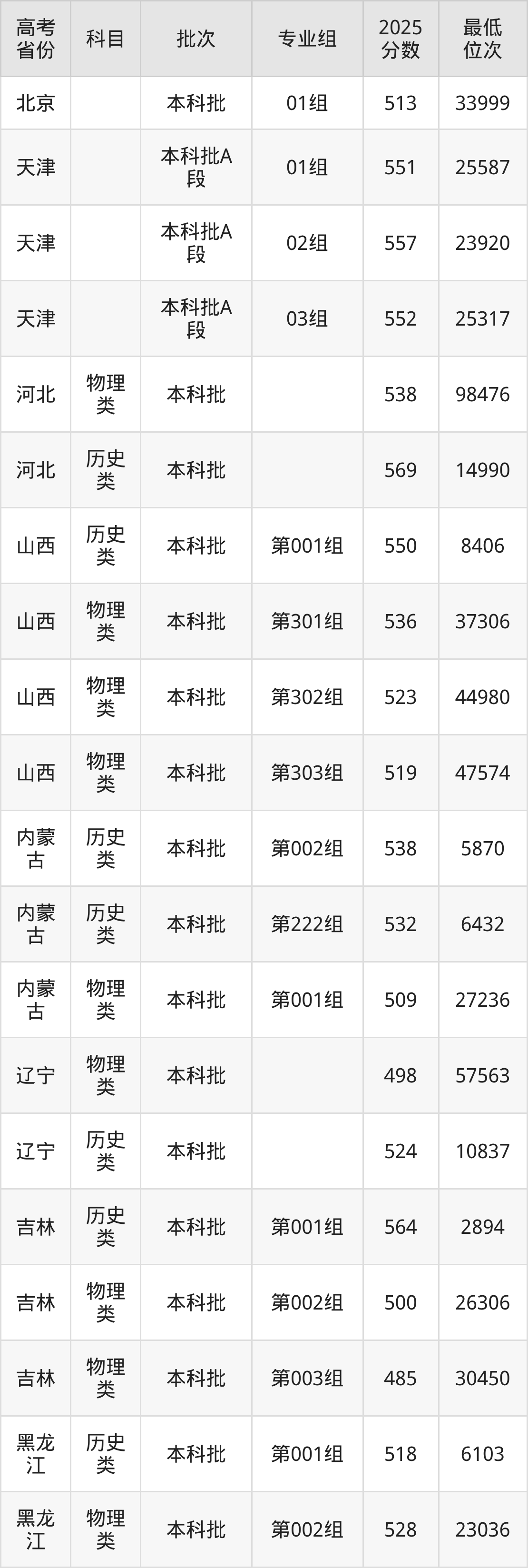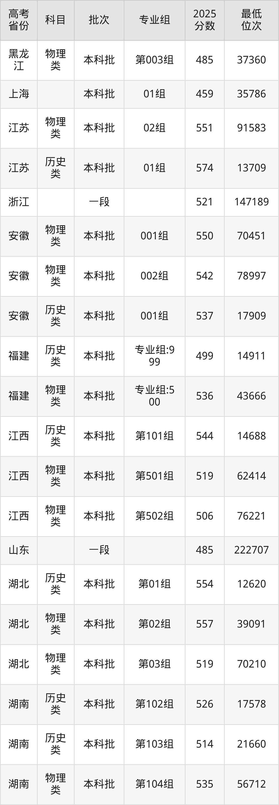 山东理工大学2025年在全国各省的最低分是450分,在山东招生的最低分是485分、最低位次是222707位,在北京招生的最低分是513分、最低位次是33999位,在天津招生的最低分是551分、最低位次是25587位。