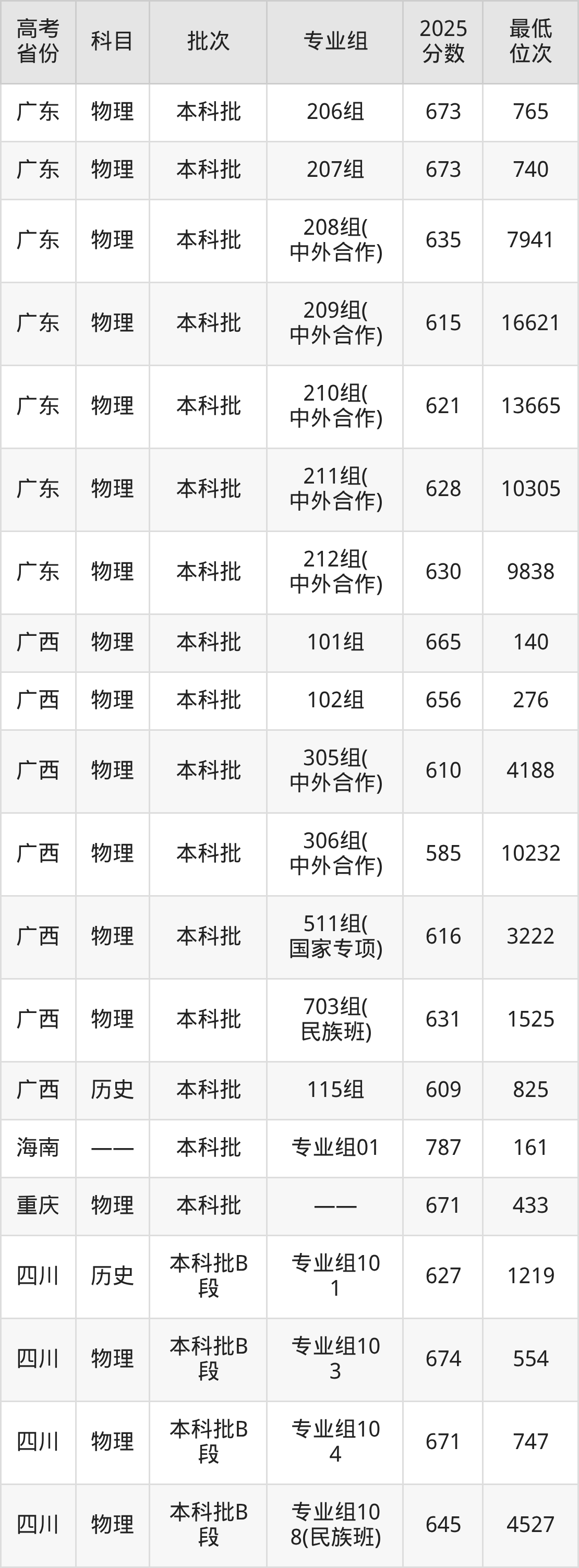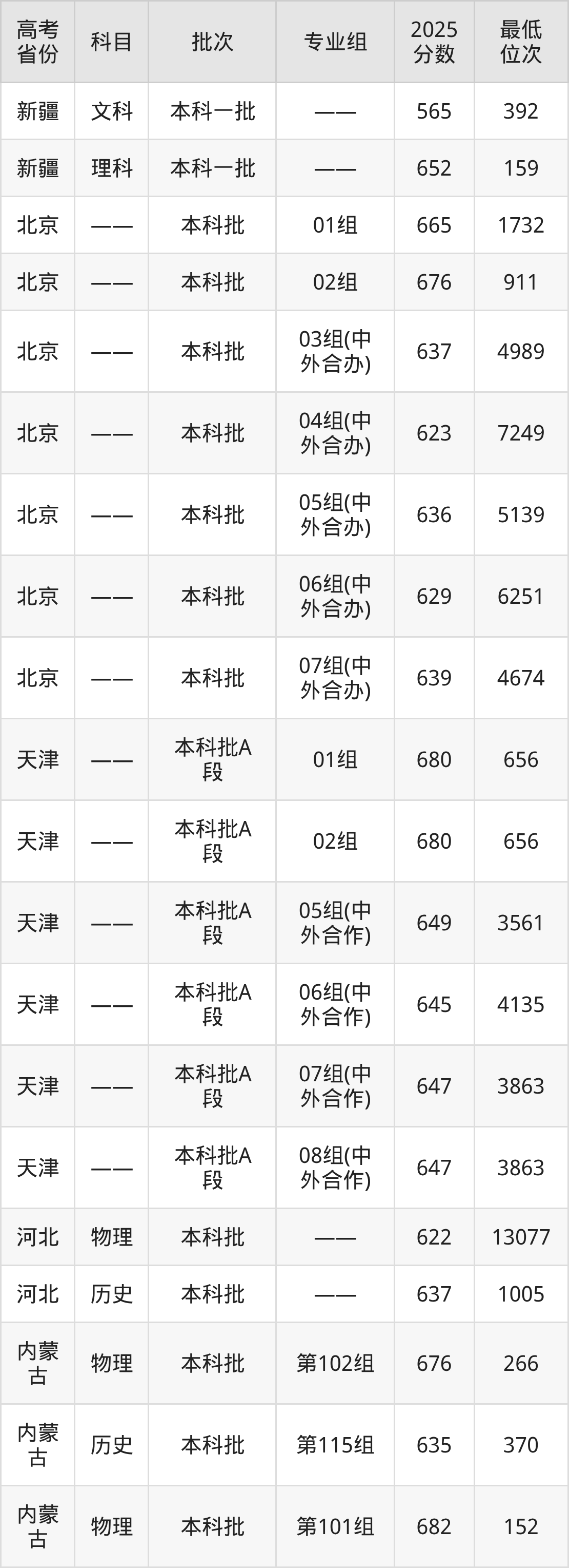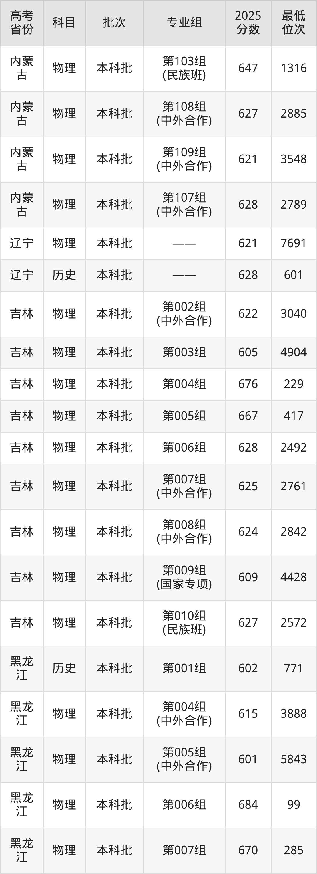哈尔滨工业大学2025年在全国各省的最低分是552分,在黑龙江历史类招生的最低分是602分、最低位次是771位,在黑龙江物理类招生的最低分是601分、最低位次是5843位,在新疆文科招生的最低分是565分、最低位次是392位。
