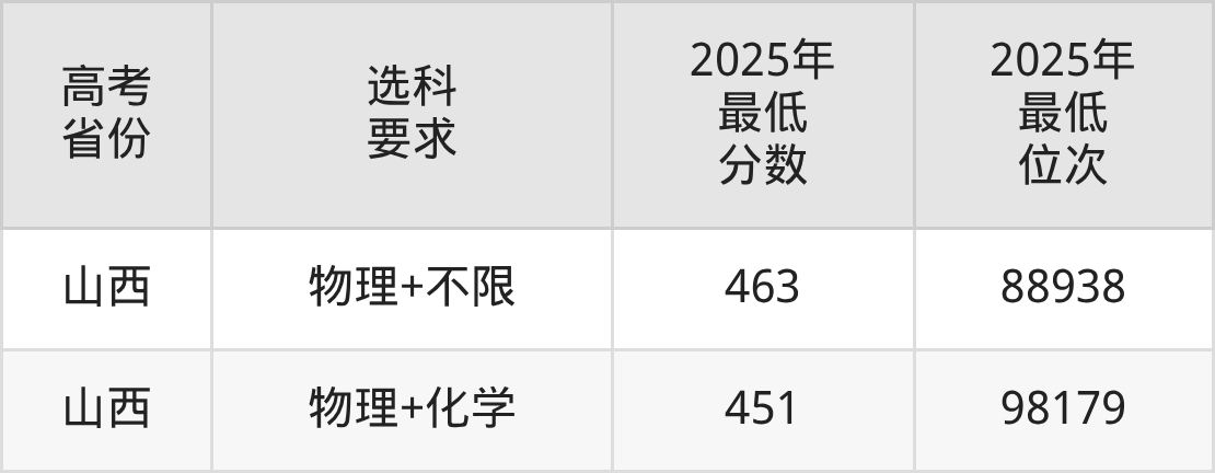 在2025年山西高考物理类招生时,211收分最低的是东北林业大学第304组(国家专项计划),最低分是448分、位次是100390位。再看山西科技学院,2025年在山西物理类的最低录取分数线是451分,最低位次是98179位。