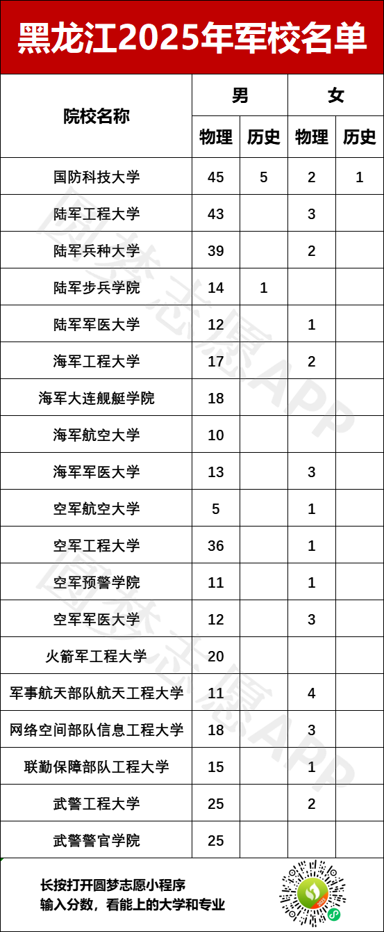 2025年在黑龙江招生的军校共计19所,分别为: