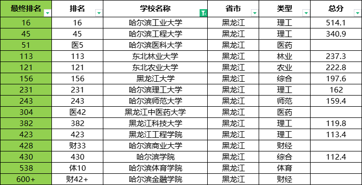 从两个榜单看,稳坐前三的学校是哈尔滨工业大学、哈尔滨工程大学,略有争议的是哈尔滨医科大学、东北林业大学。