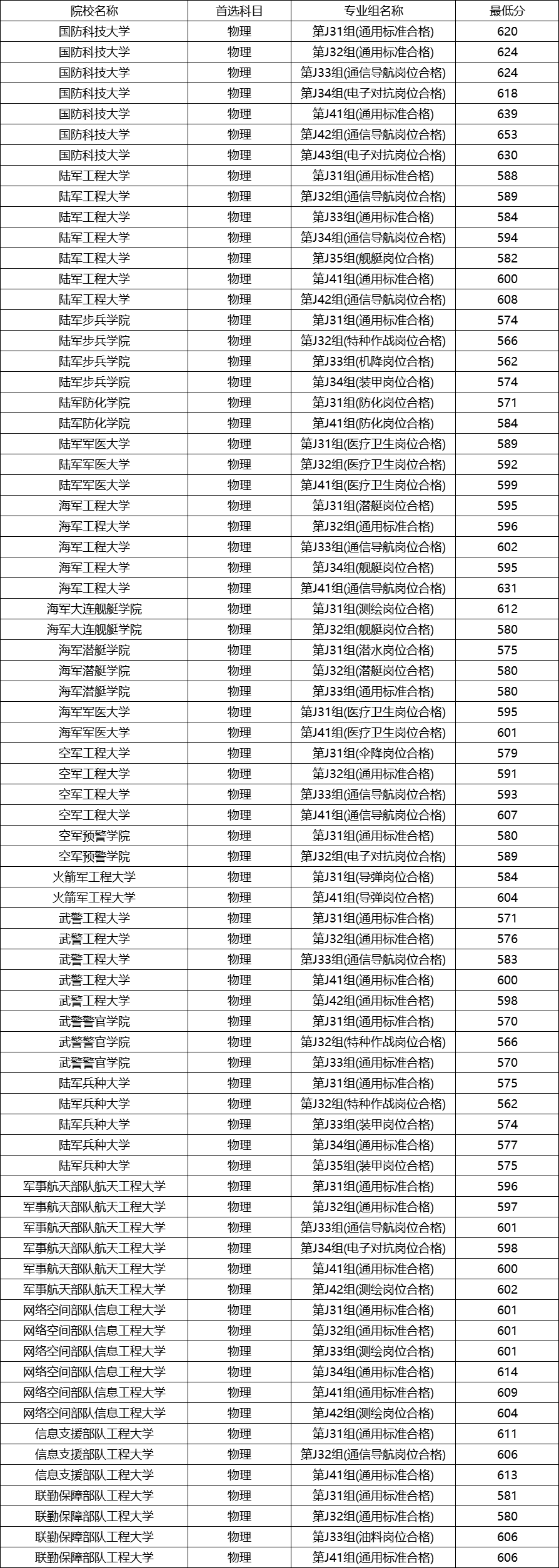 总体来看,物理类院校分数线最低为562分(陆军兵种大学特种作战岗位),最高为653分(国防科技大学通信导航岗位),考生可根据分数区间和岗位要求,结合自身体检和兴趣进行选择。高分段院校如国防科技大学和网络空间部队院校竞争激烈,中分段院校如海军和空军工程大学适合分数中上的考生,低分段院校如陆军步兵学院和武警警官学院则为分数稍低的考生提供了机会。