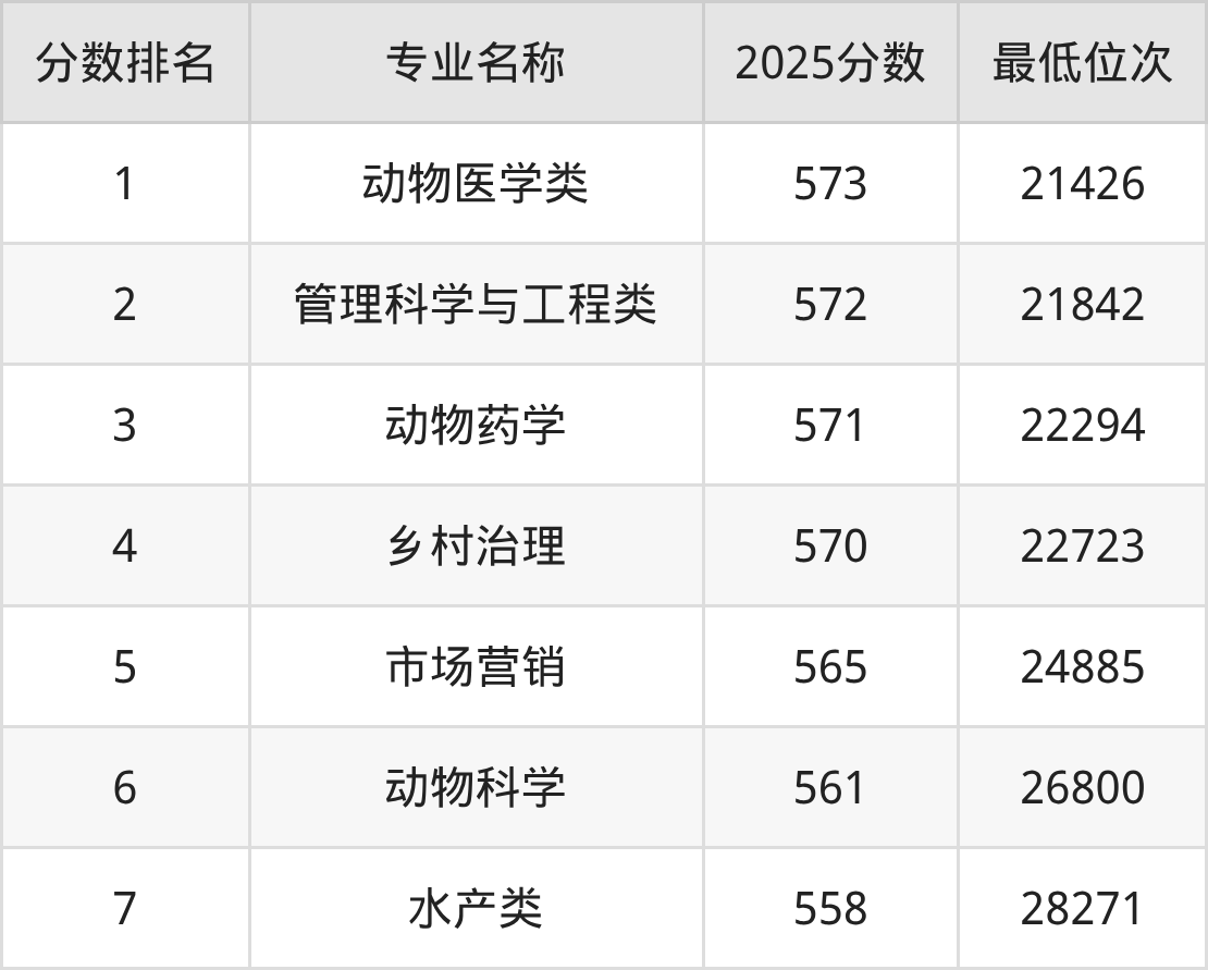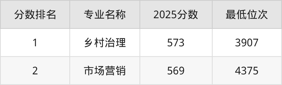 从重庆历史类考生报考的角度看,西南大学(荣昌校区)最热门的王牌专业乡村治理,2025年录取分是573分、位次是3907位,比最低分专业高了4分。