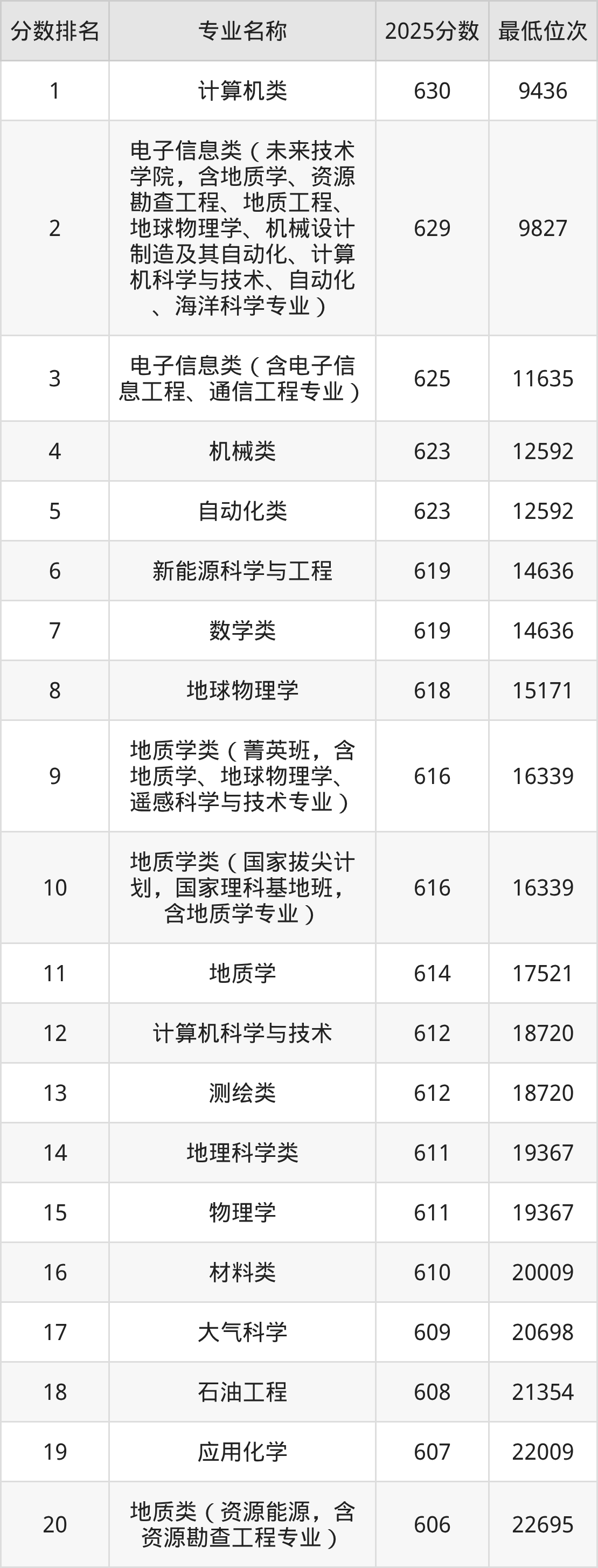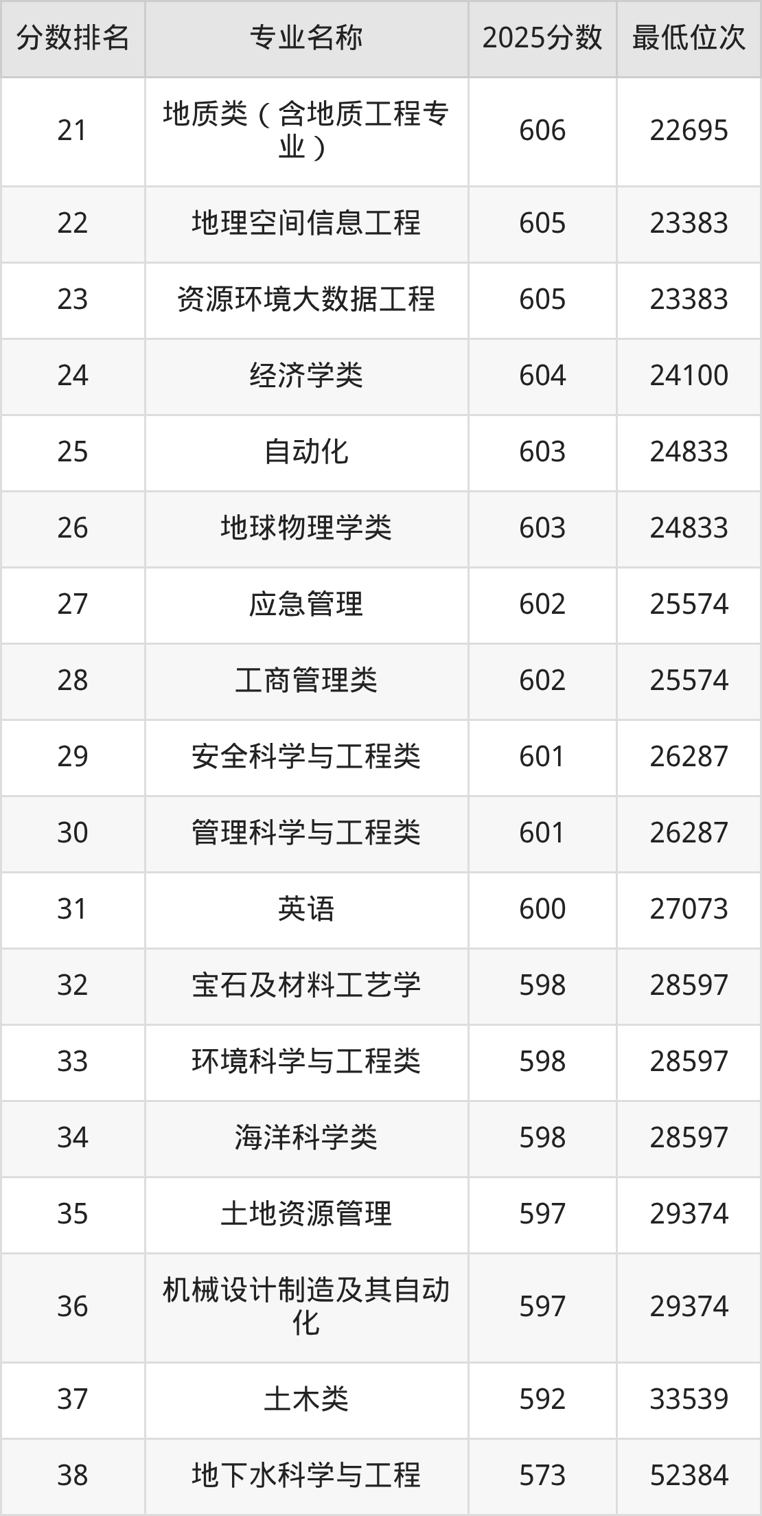 三、中国地质大学(武汉)各专业录取分数线及位次
