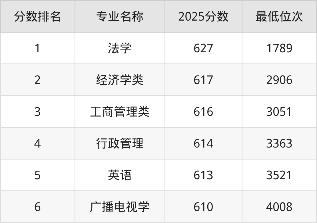 下方表格展示的是中国地质大学(武汉)其余上榜软科2025年专业排名榜单的所有数据。大家可以看看自己心仪的专业,在中国地质大学(武汉)各专业中处于什么水平。如果你的心仪专业是排名靠前的城市地下空间工程、土地资源管理等专业,则建议大家重点考虑中国地质大学(武汉)。如果你的心仪专业是中国地质大学(武汉)排名靠后的英语、会计学专业,则建议大家在能上的大学中继续看看,有没有比中国地质大学(武汉)专业实力更强的院校!