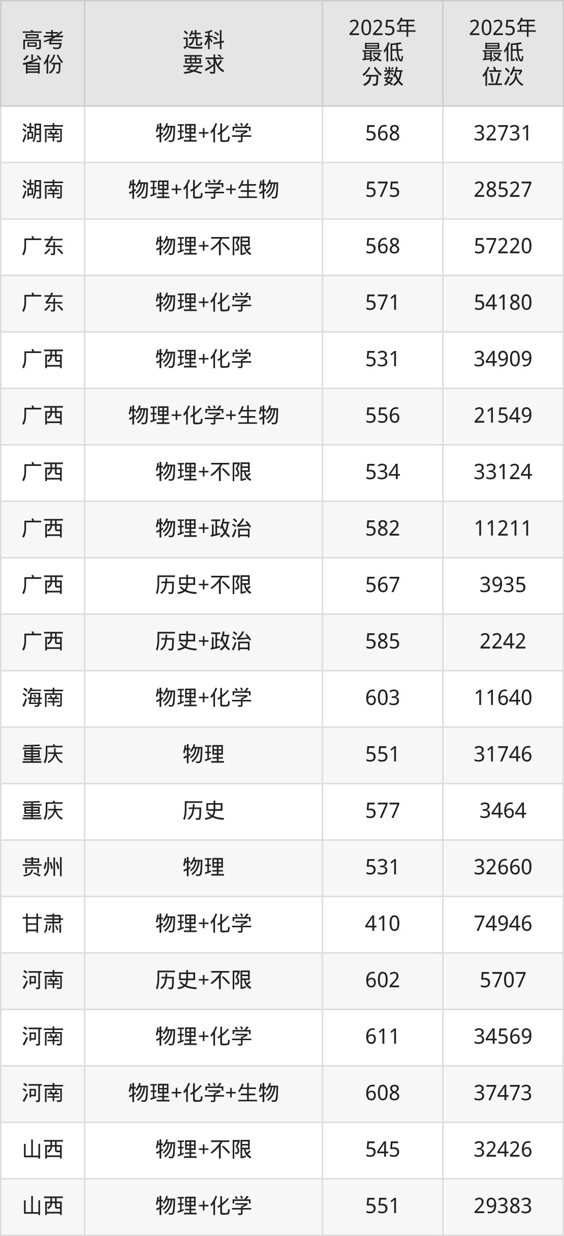 在2025年广西高考物理类招生时,985收分最低的是兰州大学503组(国家专项),最低分是514分、位次是45576位。再看广西大学,2025年在广西物理类的最低录取分数线是531分,最低位次是34909位。