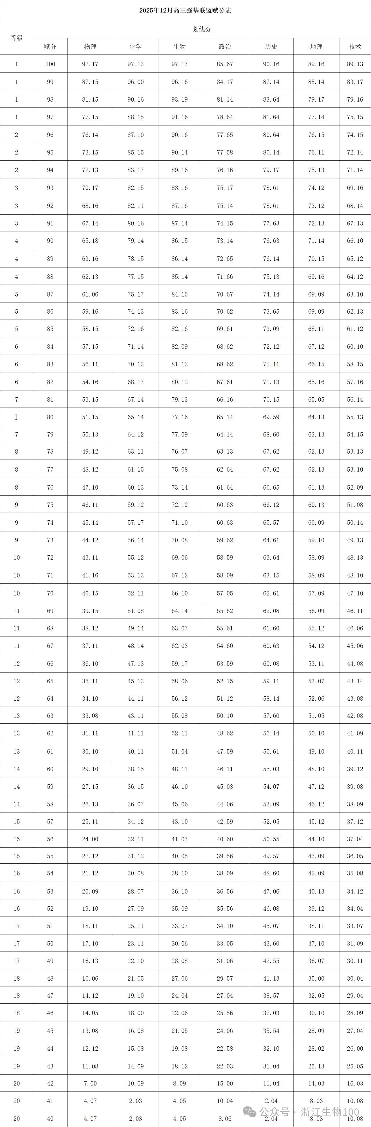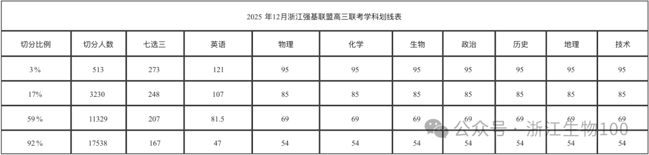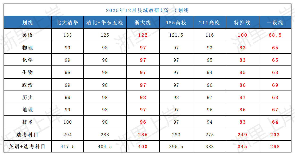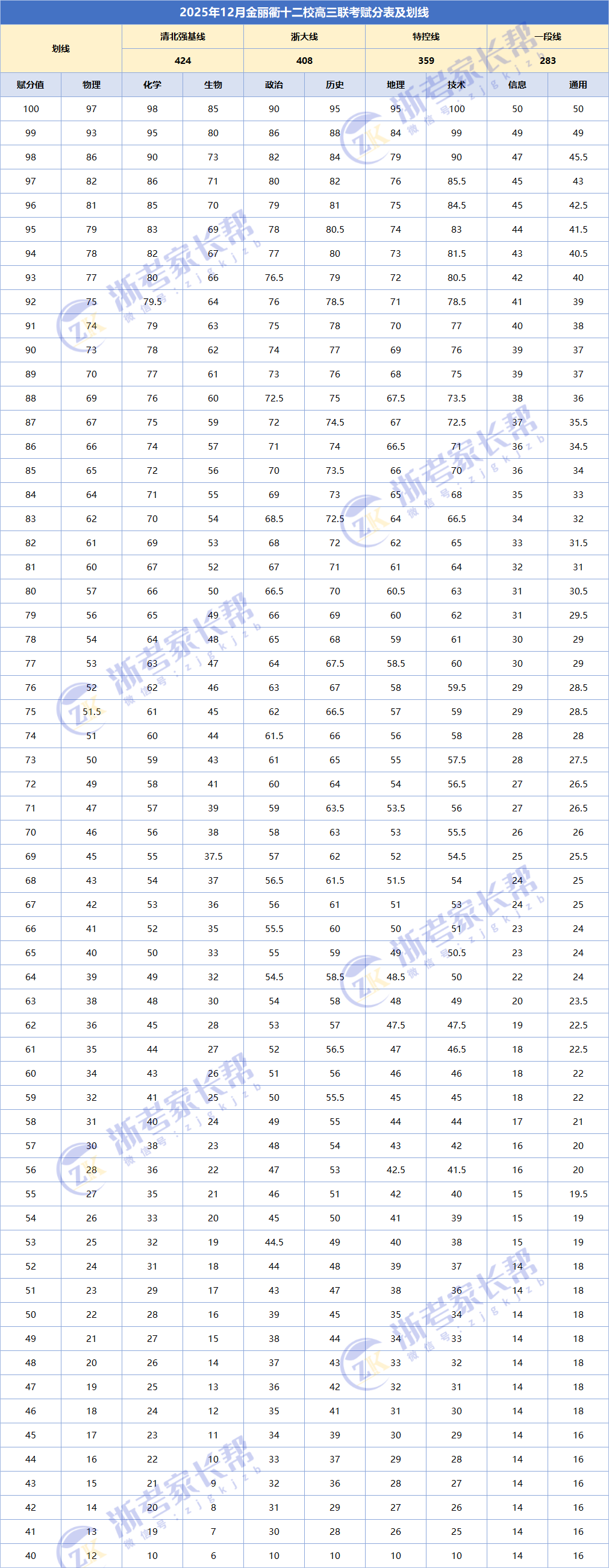 2026届浙江12月高三联考部分划线已公布,分别是:嘉兴一模特控线554分、一段线438分;金丽衢十二校特控线359分、一段线283分;强基联盟特控线354分、一段线278分;县域教研联盟特控线345分、一段线268分。