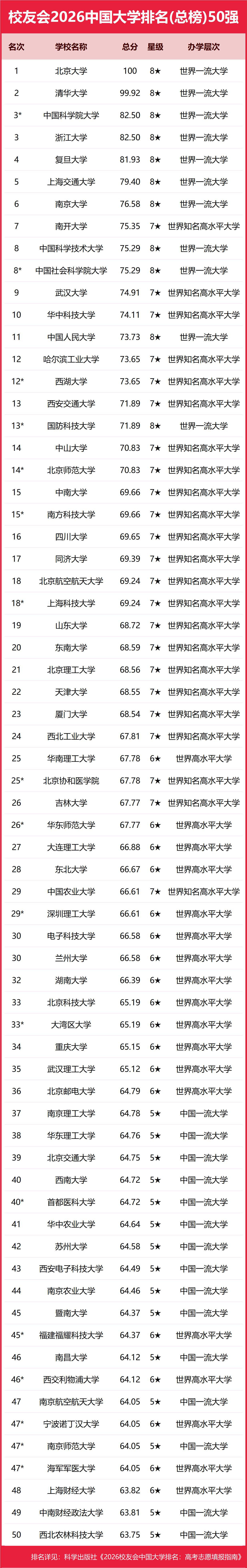 一、2026年国内大学最新排行榜出炉(前五十强)