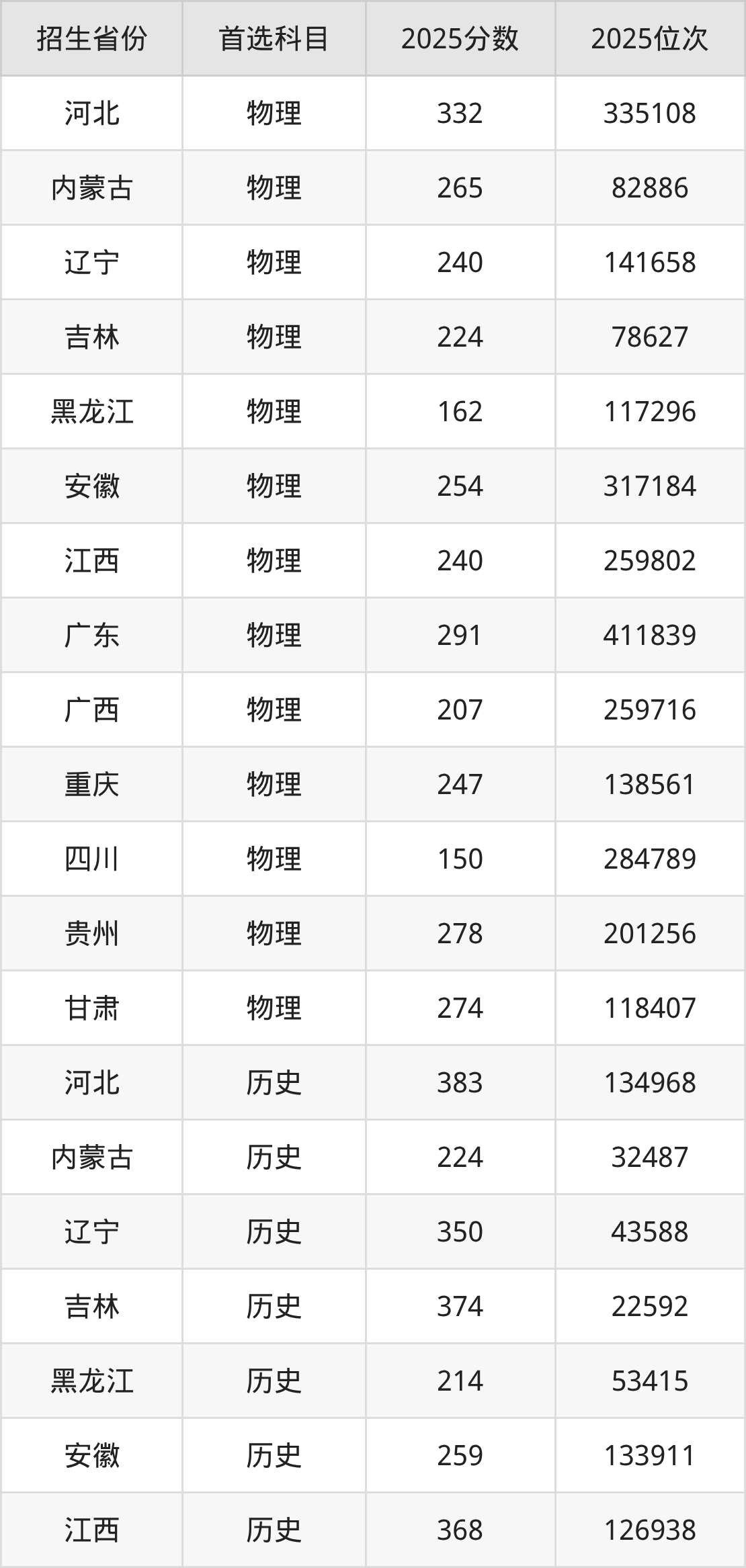 小编整理了黑龙江幼儿师范高等专科学校2025年在全国14省的最低录取分数线及位次汇总,供2026年高考生报考前参考!各省物理类最低分是150分至332分、各省历史类最低分是150分至383分、“3+3选科模式”省份最低分是299分。