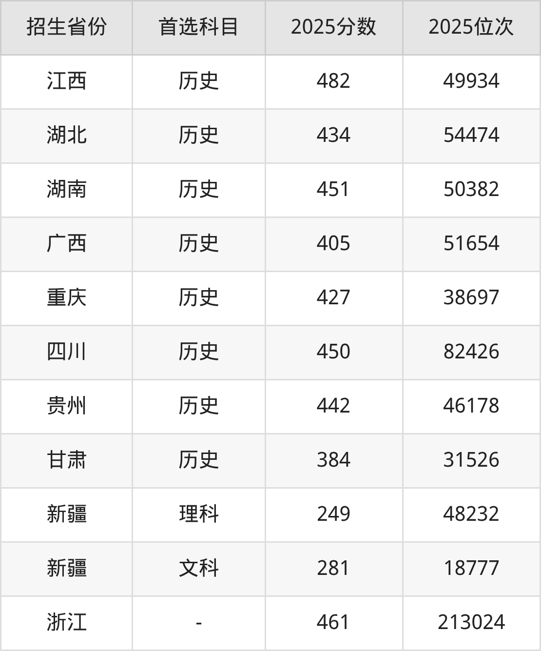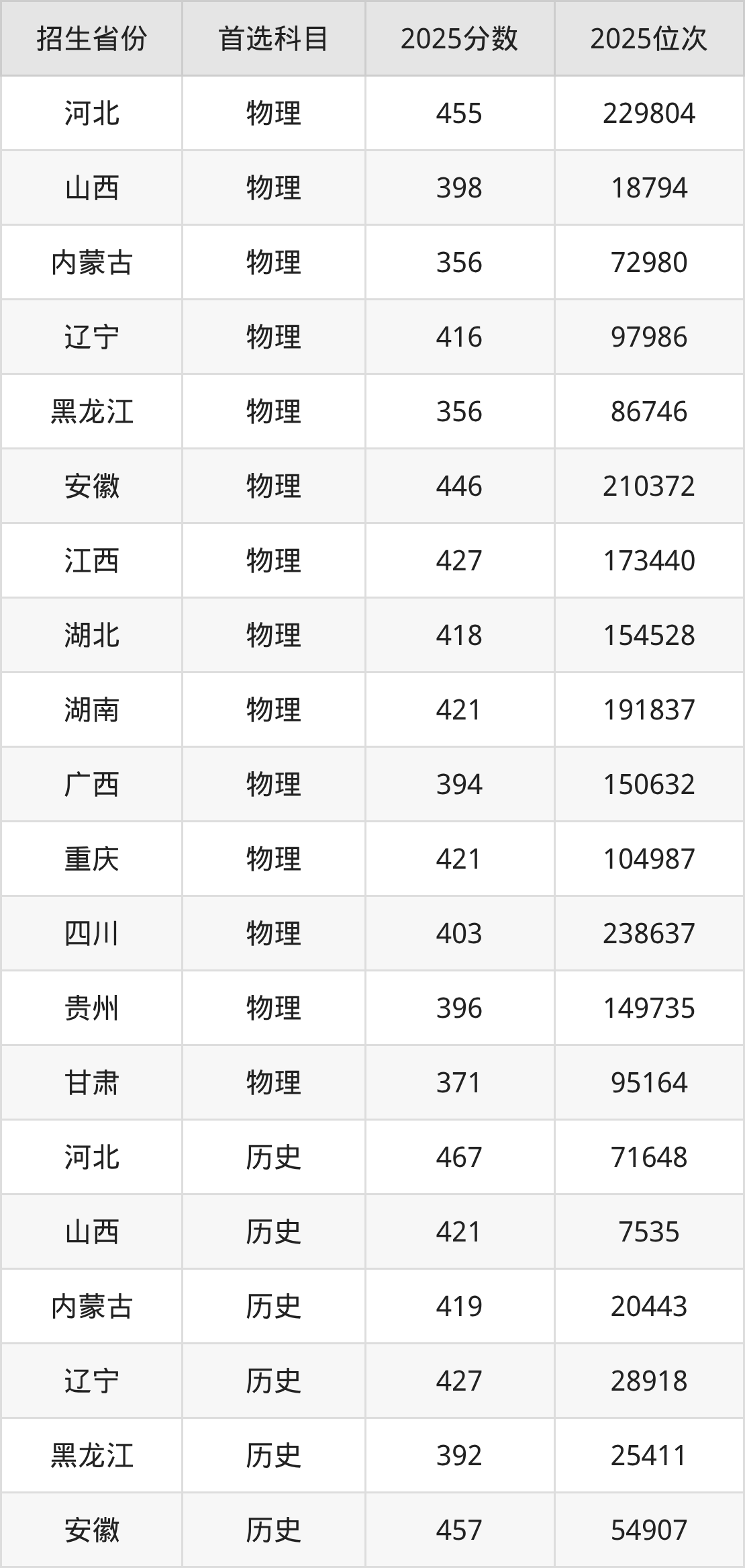 小编整理了浙江工商职业技术学院2025年在全国16省的最低录取分数线及位次汇总,供2026年高考生报考前参考!各省物理类最低分是356分至455分、各省历史类最低分是384分至482分、“3+3选科模式”省份最低分是461分。