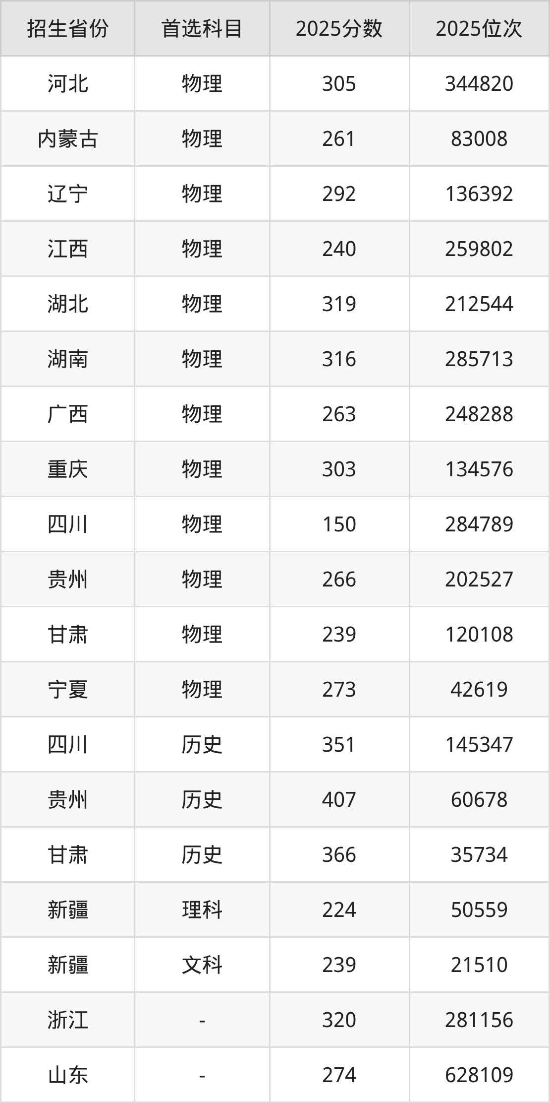 小编整理了阿克苏职业技术学院2025年在全国15省的最低录取分数线及位次汇总,供2026年高考生报考前参考!各省物理类最低分是150分至319分、各省历史类最低分是351分至407分、“3+3选科模式”省份最低分是274分至320分。