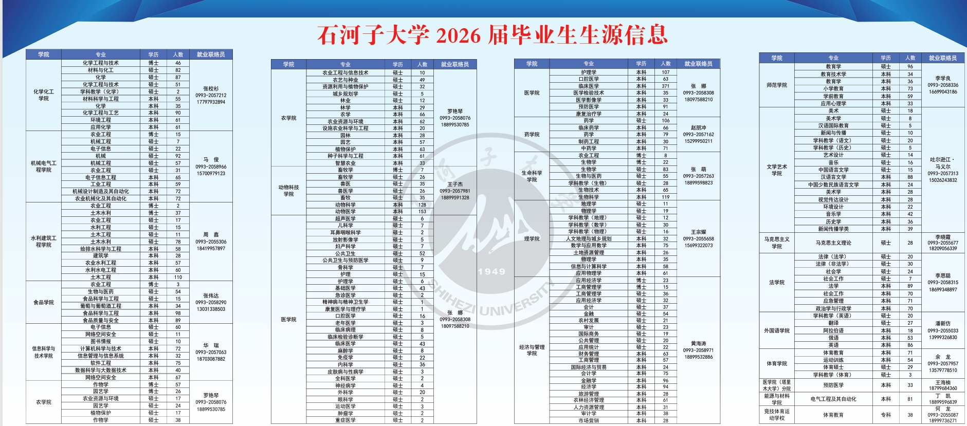 下方表格展示的是石河子大学的各个二级学院的毕业生人数、及本科各专业的毕业生人数汇总!