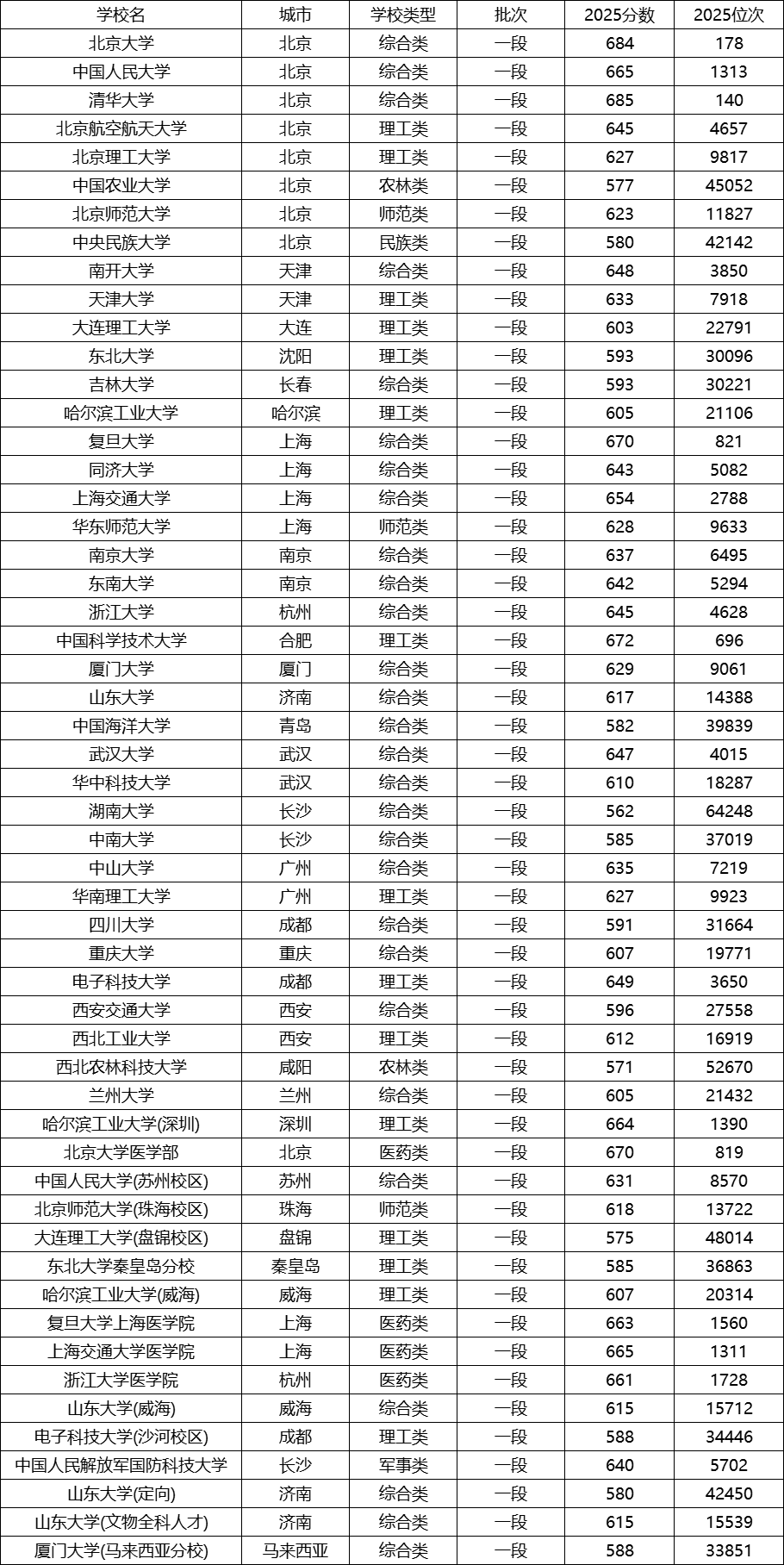 从2025年录取数据来看,山东省考生最低考取985高校的分数为562分,对应高校为湖南大学,位次为64248名。这也是所有985高校在山东录取的“最低门槛”。