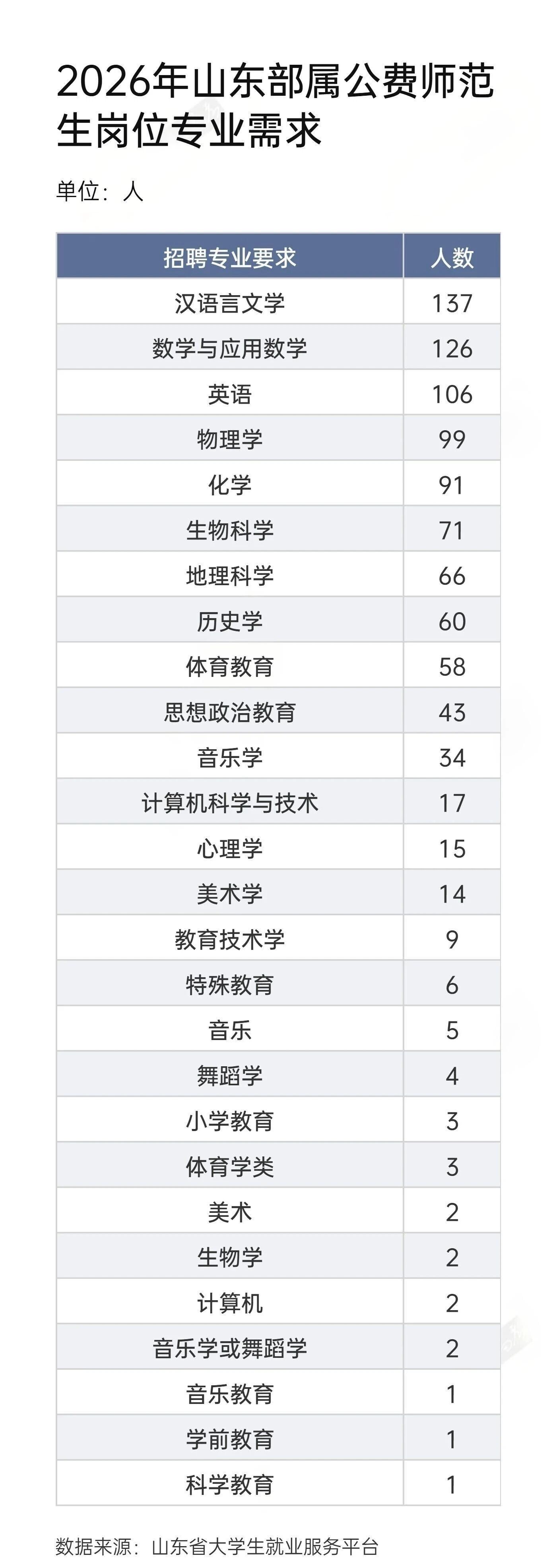 从专业需求看,汉语言文学(137人)、数学与应用数学(126人)、英语(106人)位列前三,与新高考背景下语数英的权重匹配。物理(99人)、化学(91人)、生物(71人)紧随其后,地理(66人)、历史(60人)也需求旺盛。体育、音乐、美术等艺体学科同样有岗位,信息技术、心理学等新兴学科也开始发力。