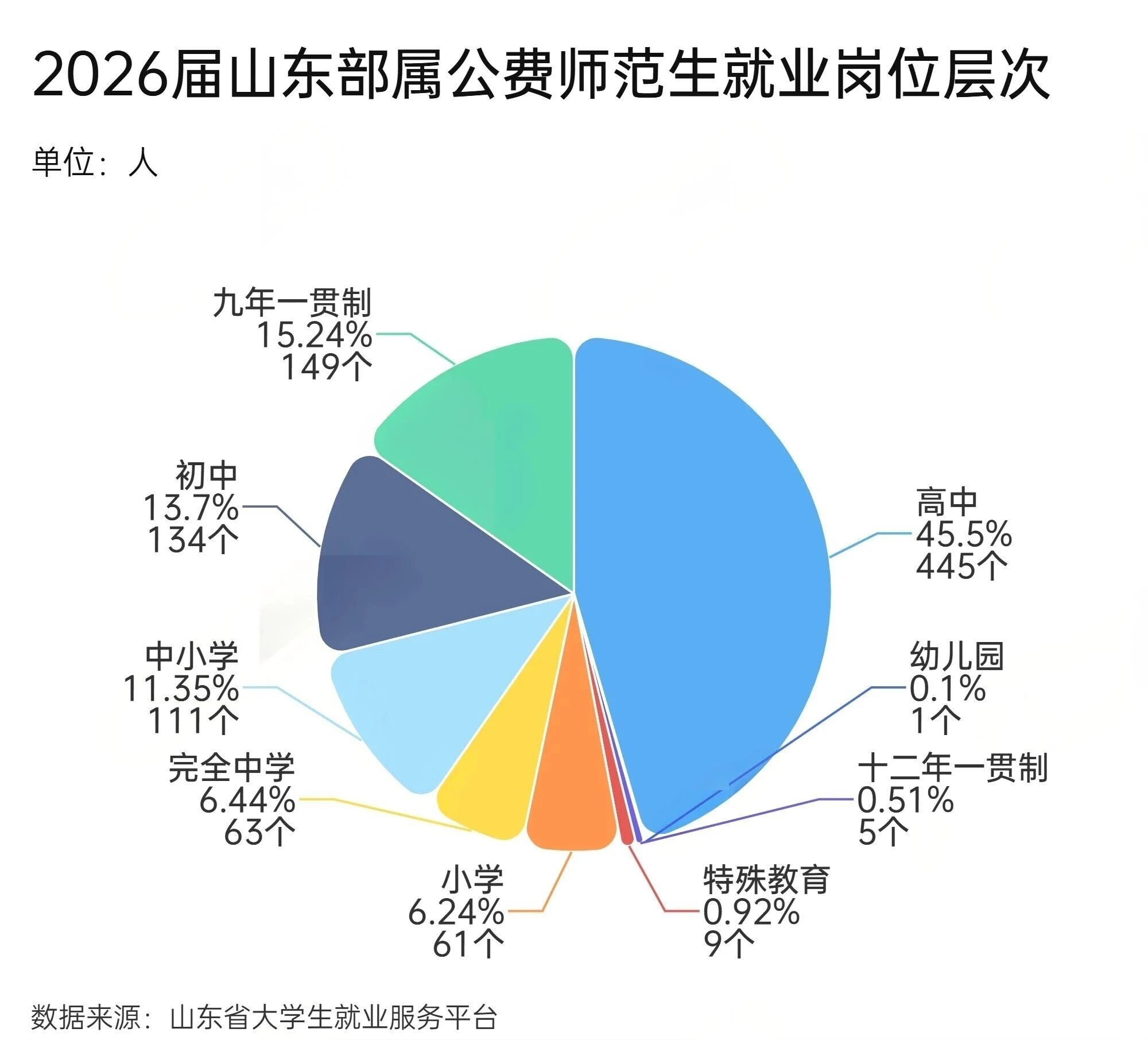 高中岗位占45.5%,远超省属公费师范生(后者多面向初中和小学)。此外,九年一贯制学校(小学初中一体)占比约15%,纯初中占13.7%,小学占15.2%,还有少量完全中学(6.4%)和特殊教育岗位。这意味着部属公费师范生有更多机会进入重点高中,发展平台更高。