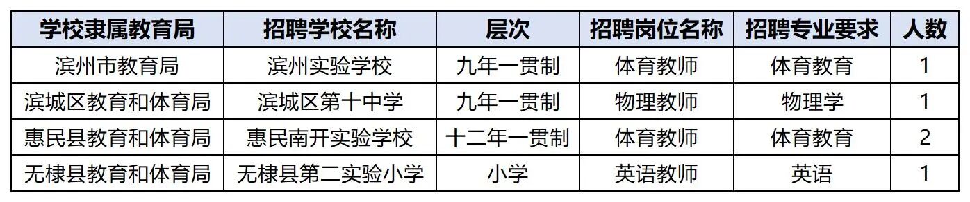 滨州实验学校体育1人,滨城区十中物理1人,惠民南开实验学校体育2人,无棣县第二实验小学英语1人。