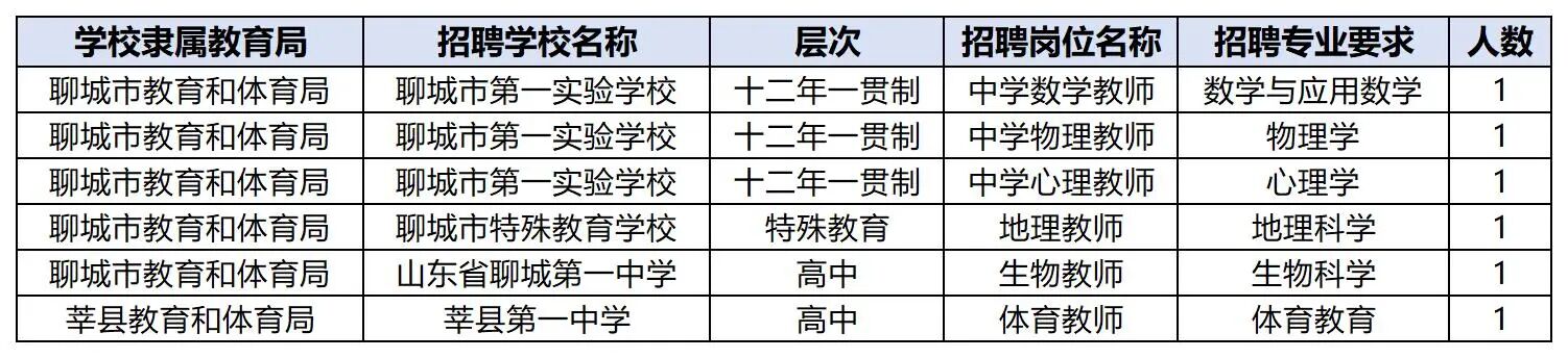 聊城第一实验学校招聘数学、物理、心理各1人,聊城特殊教育学校招聘地理1人,聊城一中生物1人,莘县一中体育1人。