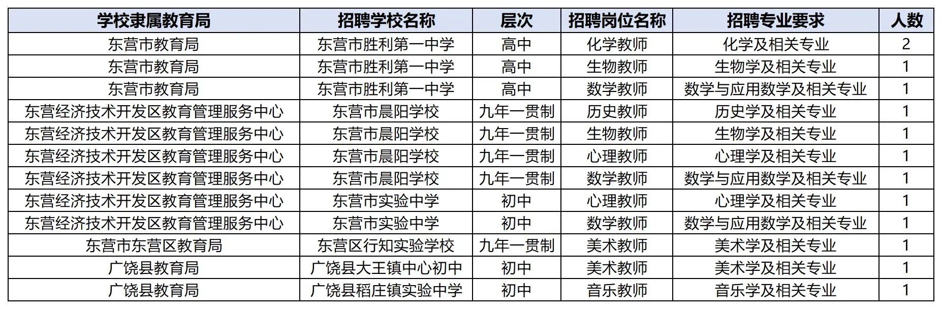 东营市胜利一中、晨阳学校等提供多学科岗位: