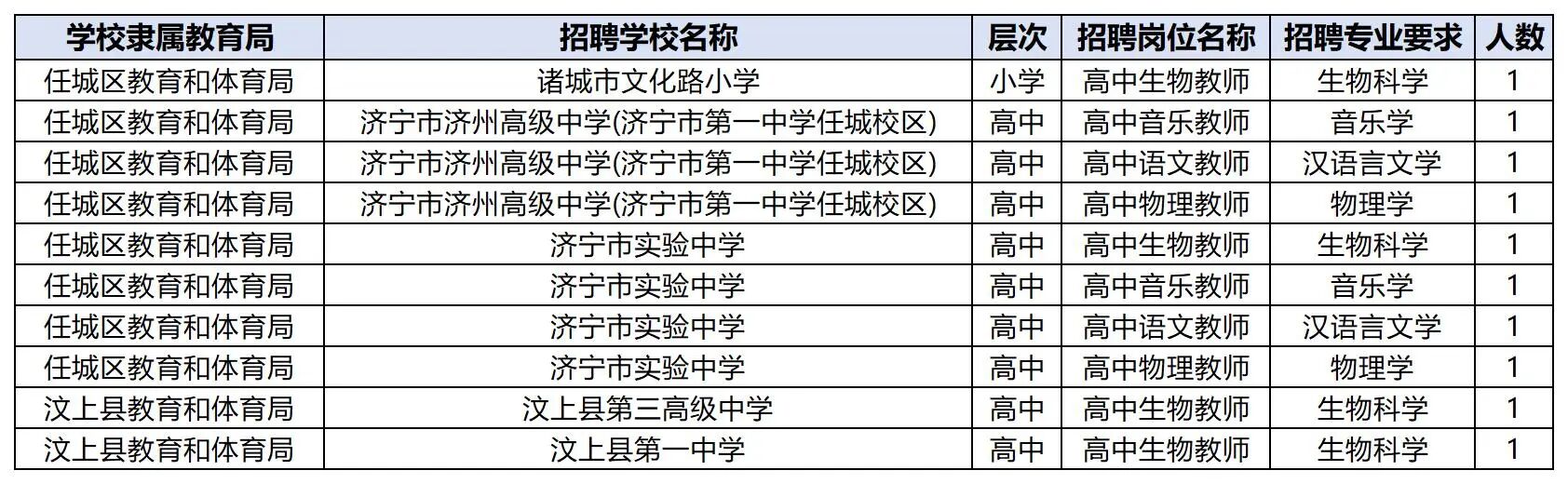 济宁市实验中学:生物、音乐、语文、物理各1。