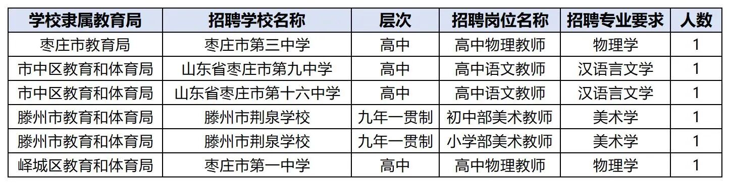 枣庄三中物理1人,枣庄九中、十六中语文各1人,滕州市荆泉学校美术教师2人(初中、小学各1),峄城区枣庄一中物理1人。