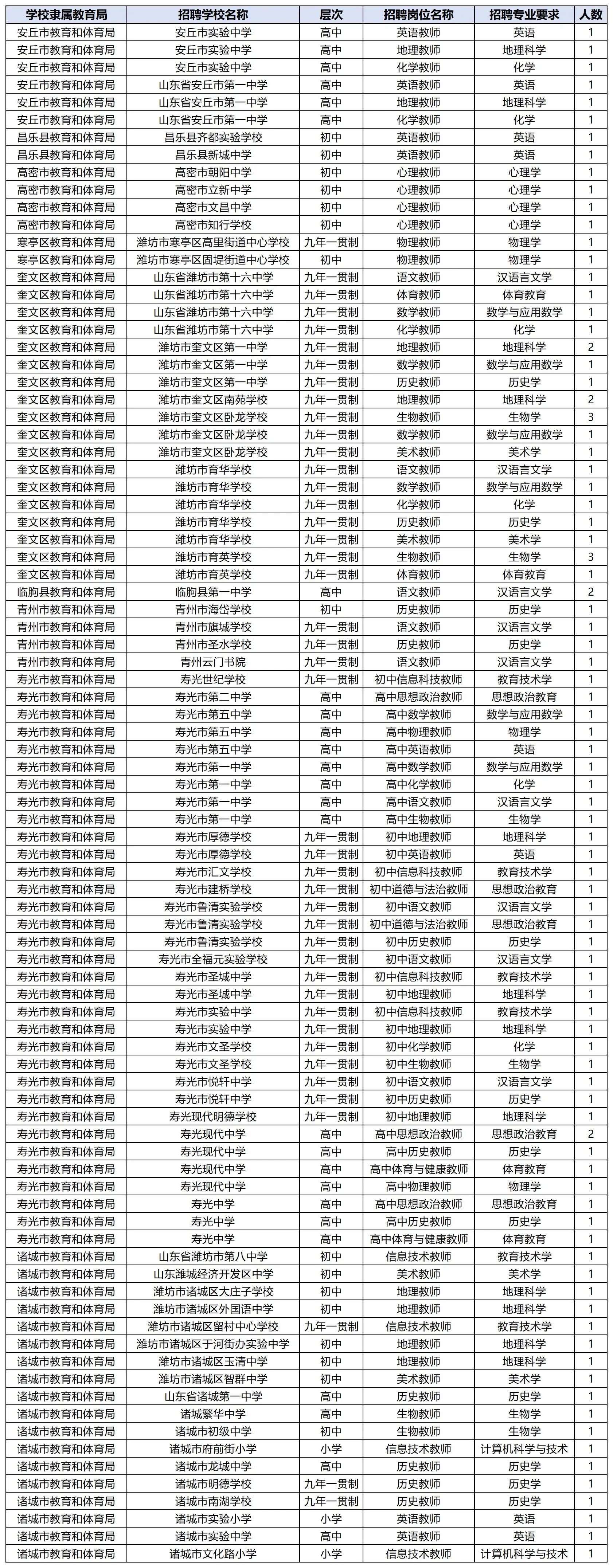 安丘市实验中学:英语、地理、化学教师各1人。