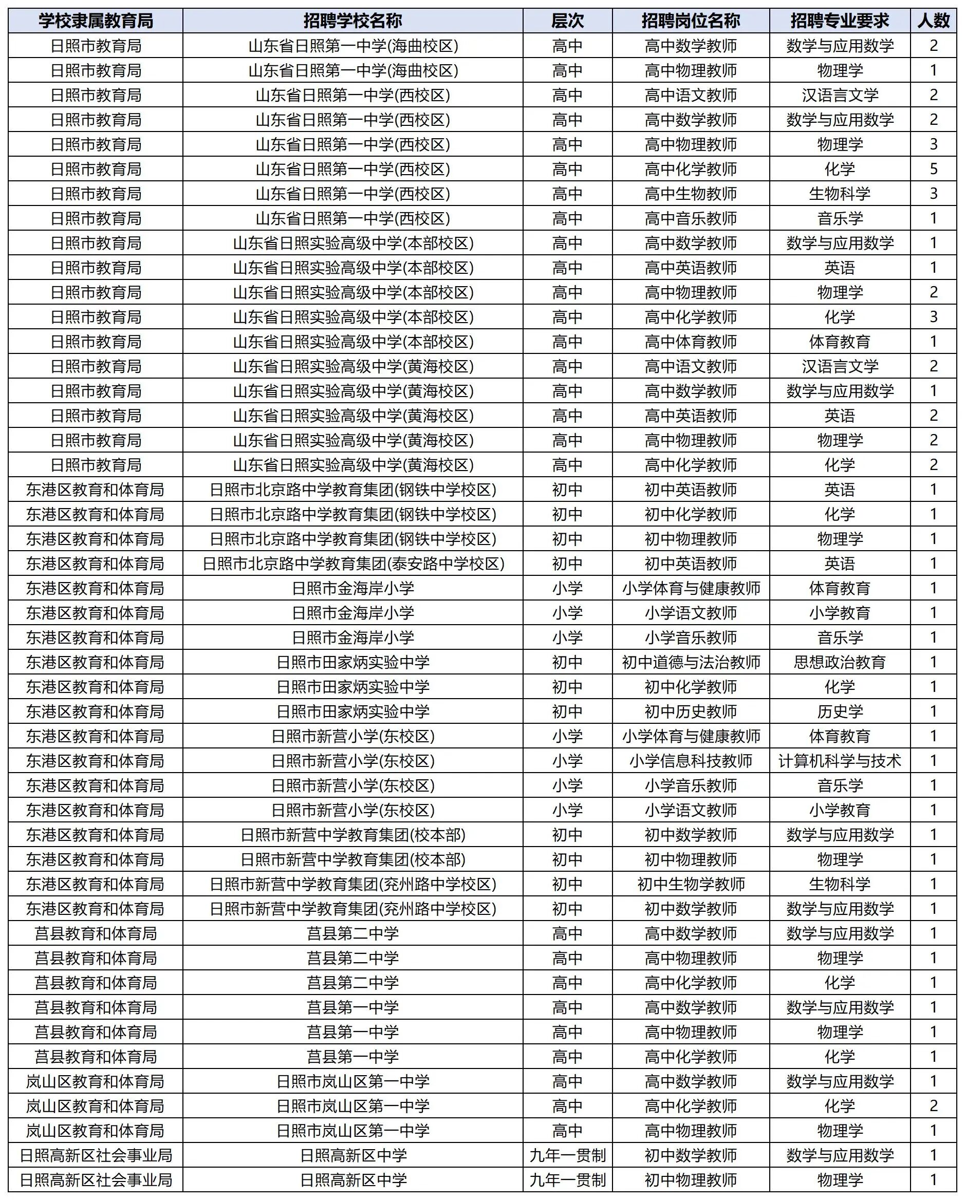 日照以高中岗位为主,日照一中、实验高中等名校需求量大: