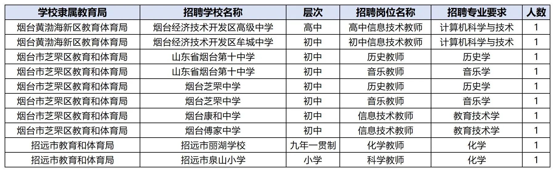 烟台开发区高级中学、牟城中学:信息技术各1。