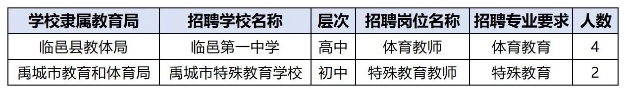 临邑一中体育教师4人,禹城市特殊教育学校特殊教育教师2人。