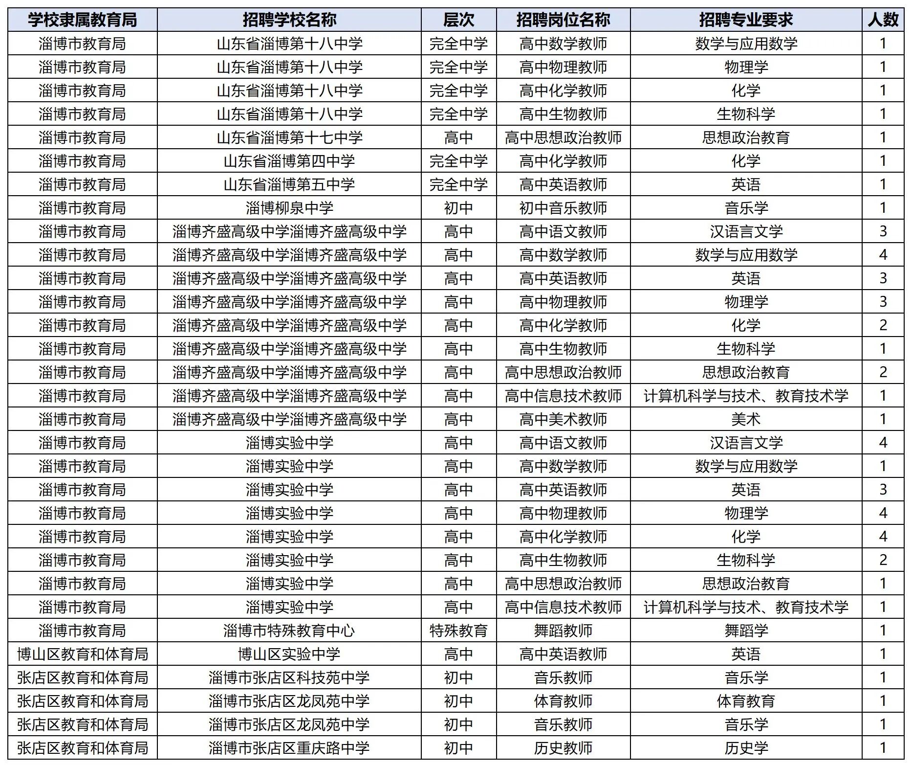淄博实验中学:语文4、数学1、英语3、物理4、化学4、生物2、思政1、信息技术1。