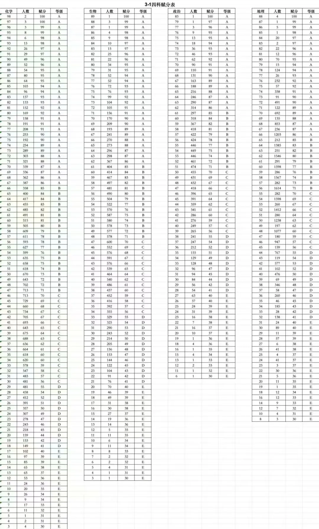 新高考模式下,选考科目采用等级赋分制,考生的最终成绩取决于其卷面成绩在全体考生中的相对位置。本次零模提供了详细的赋分数据,以化学科目为例,让我们了解赋分规则。