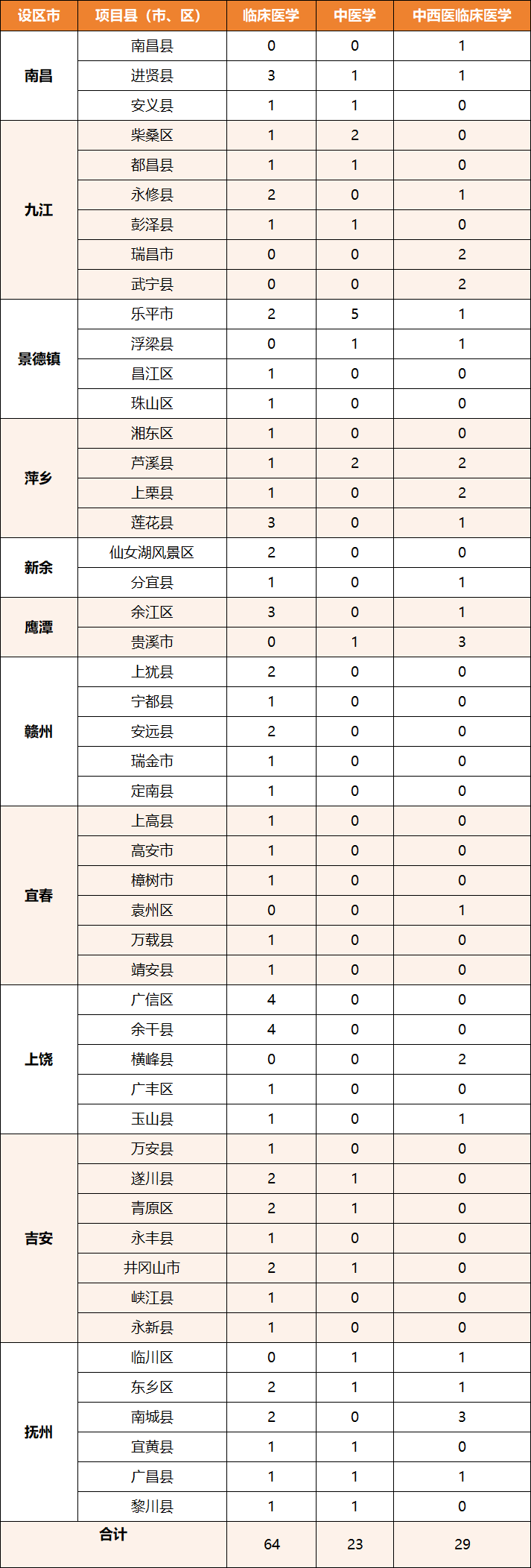 其中:南昌市南昌县中西医临床医学1人,进贤县临床医学3人,中医学1人,中西医临床医学1人,安义县临床医学1人,中医学1人;九江市柴桑区临床医学1人,中医学2人,都昌县临床医学1人,中医学1人,永修县临床医学2人,中西医临床医学1人,彭泽县临床医学1人,中医学1人,瑞昌市中西医临床医学2人等,分地区招生计划如下: