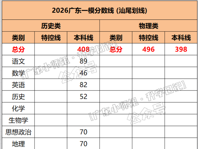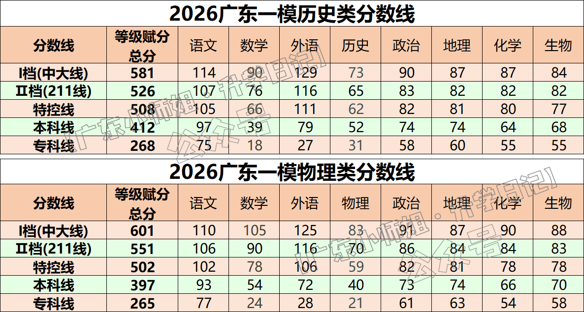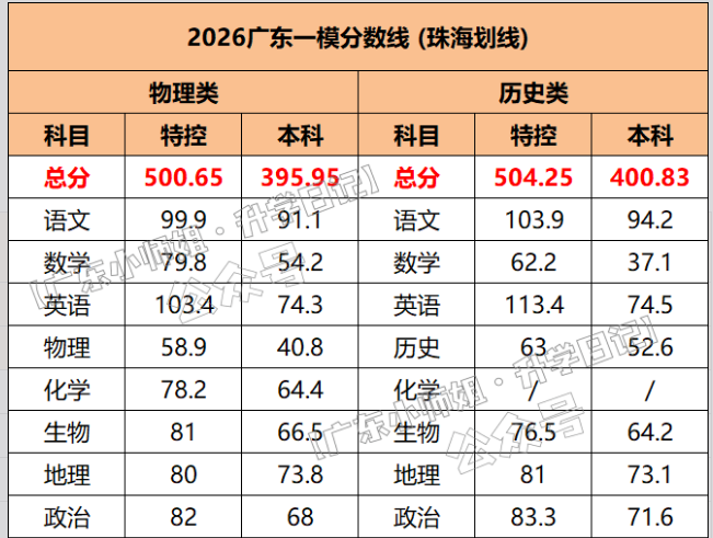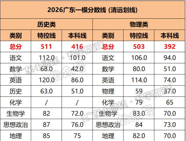 2026年广东一模分数线已公布!其中,韶关的分数线为:物理类特控线510分,本科线404分;历史类特控线526分,本科线427分。